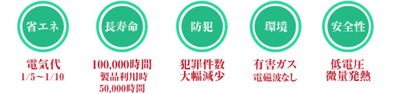 | フジコウライトシリーズはLEDを光源とした街路灯は寿命が長く、虫が寄りつきにくいなど、はよく知られていますが消費電力とCO2排出量を大幅に削減できる―これがLEDの一番の魅力です。当社では特に防犯の効果に着目し、 青色LEDによる鎮静作用を応用した街路灯の開発を行っています。 |