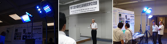 | ハイパワーLED街路灯をはじめとしたパネル、商品展示を行いました。また、臼田昭司 教授、弊社代表取締役芳谷輝一による講演を行いました。 |