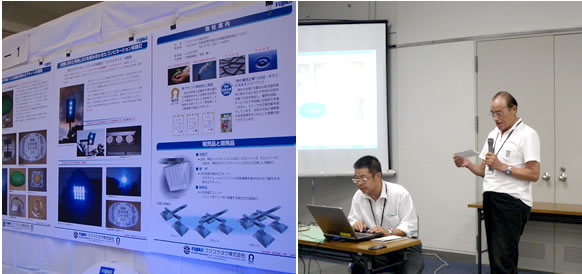 | ハイパワーLED街路灯をはじめとしたパネル、商品展示を行いました。また、臼田昭司 教授、弊社代表取締役芳谷輝一による講演を行いました。 |